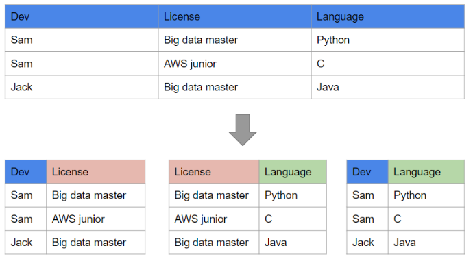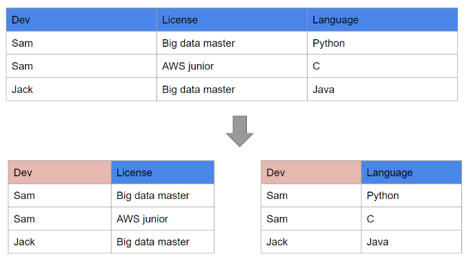 위 테이블은 개발자가 많은 자격증을 가질 수도 있고, 많은 언어를 사용할 수도 있는데, 자격증과 언어를 합쳐 놓을 경우 이상 현상이 발생할 수 있다.