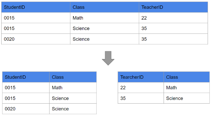 부분적으로 연관되어 있는 두 값을 나누는 것이 2차 정규화로, 부분함수 관계를 끊어서 아래 테이블이 된 것이 2차 정규화가 된 것이다.