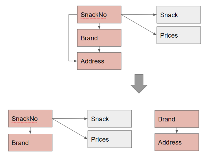 위 테이블의 SnackNo이 Brand와 연관이 있고 Brand가 Address로 연관되어 있어 이행함수 관계이다.