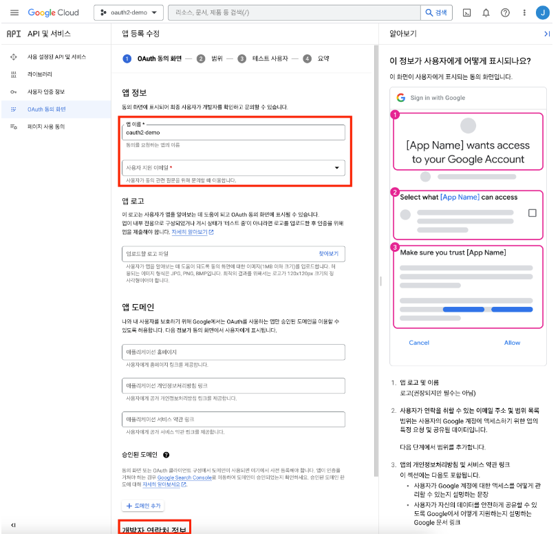 4. 앱 정보에 앱 이름, 사용자 지원 이메일, 개발자 연락처 정보를 입력한다.