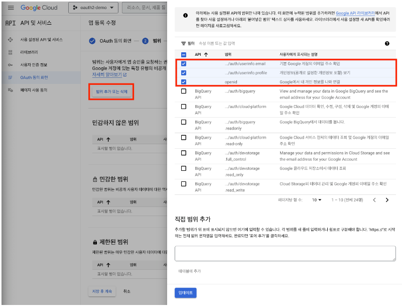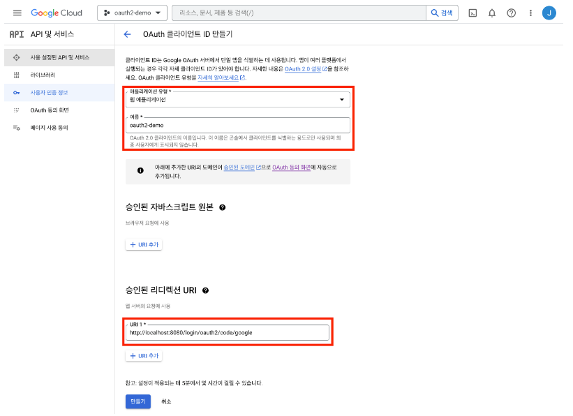 - 승인된 리디렉션 URI에 주소(예: http://localhost:8080/login/oauth2/code/google)을 입력하여 OAuth 클라이언트 ID를 생성한다.