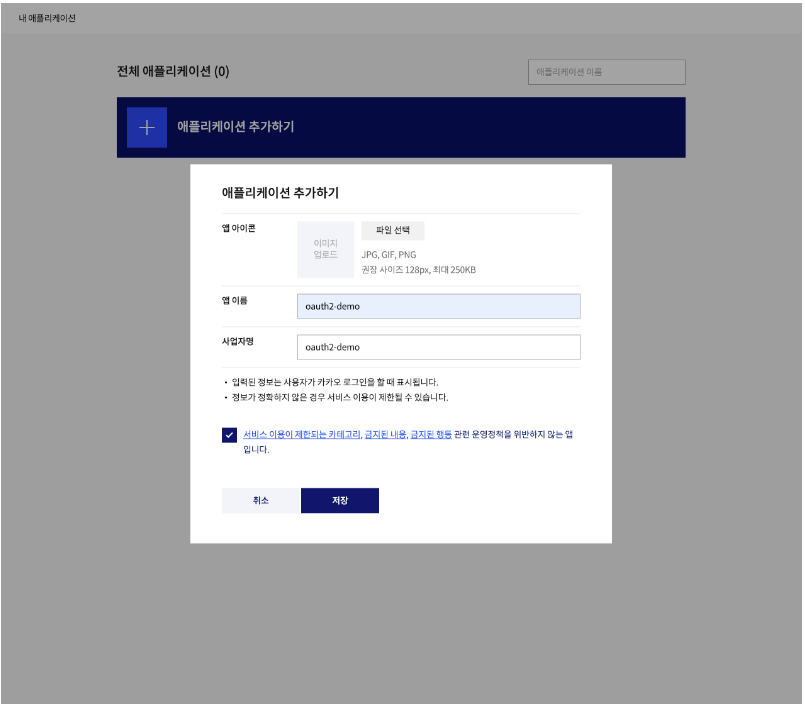 1. https://developers.kakao.com에서 내 애플리케이션 → 애플리케이션 추가하기를 선택한다.