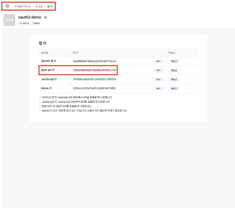 3. 메뉴에서 앱 설정 → 앱 키를 선택하면 나오는 REST API 키가 Client ID 값이다.