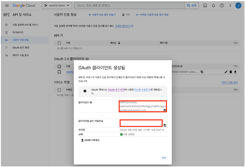9. 클라이언트 ID가 Client ID 값이고 클라이언트 보안 비밀번호는 Client Secret 값이다.