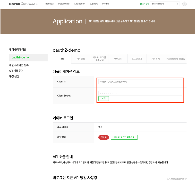 3. 애플리케이션을 생성하면 Client ID와 Client Secret 정보를 발급받는데 유출되지 않도록 주의한다.