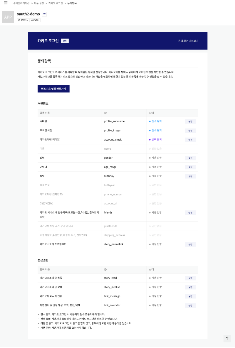 - 카카오 계정(이메일)은 애플리케이션 검수를 받아야 설정할 수 있다.