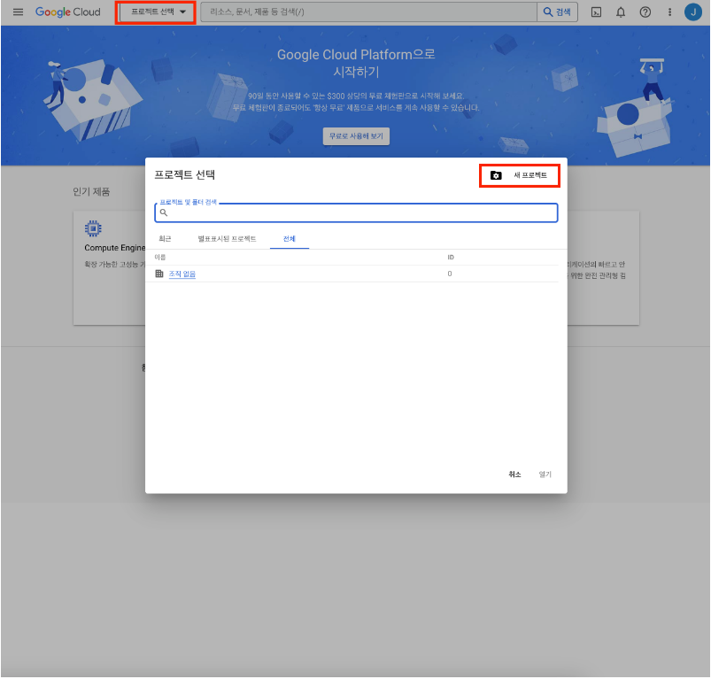 1. https://console.cloud.google.com에서 상단의 프로젝트 선택을 누르고 프로젝트를 선택한다.