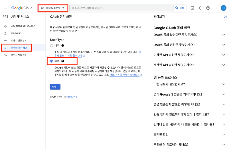 3. 상단에서 생성한 프로젝트를 선택하고 메뉴 → API 및 서비스 → OAuth 동의 화면을 선택