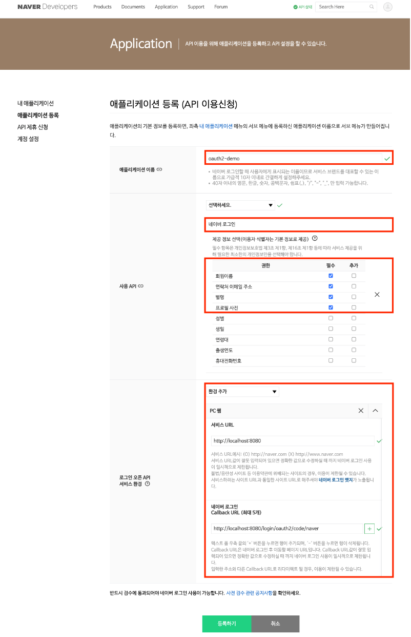 - 예) http://localhost:8080 , http://localhost:8080/login/oauth2/code/naver