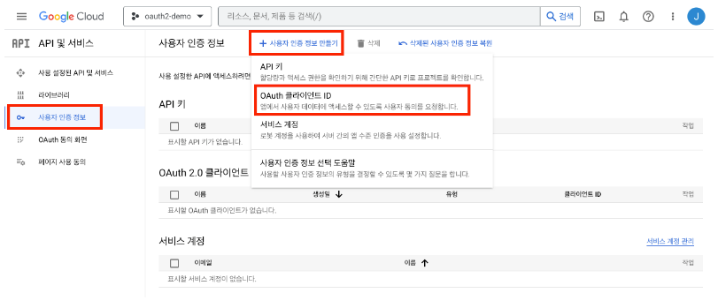 7. 메뉴 → API 및 서비스 → 사용자 인증 정보로 이동 후 사용자 인증 정보 만들기 → OAuth 클라이언트 ID를 선택한다.