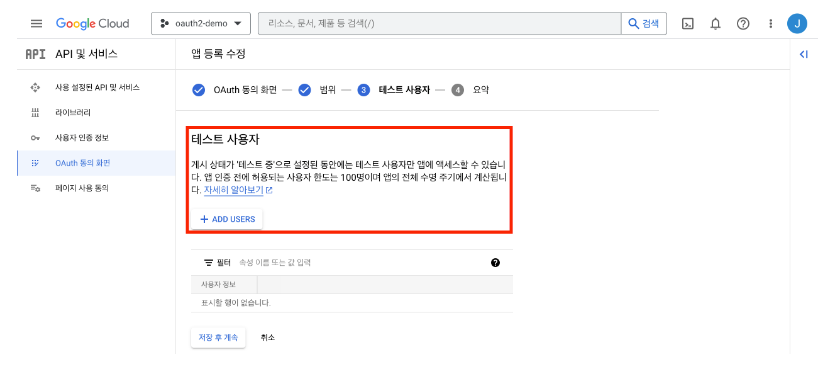6. 테스트 사용자를 입력한다(이메일 주소)
