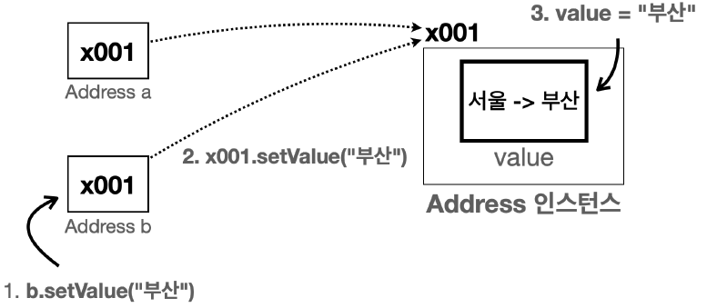 - a, b는 같은 인스턴스를 참조하기 때문에 a의 값도 함께 부산으로 변경된다.
