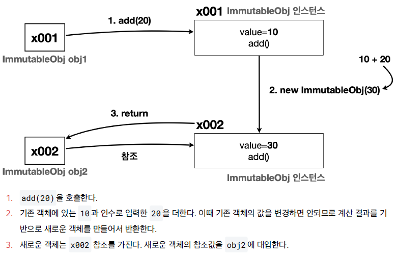 - 불변 객체는 값이 변경되면 안되므로, 기존 값을 변경하지 않고 계산 결과를 바탕으로 새로운 객체를 만들어서 반환하는 것으로 불변 객체의 값을 변경한다.