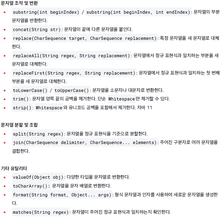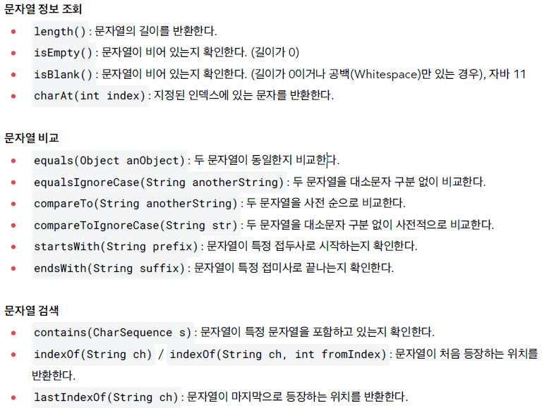 String 클래스는 문자열로 처리할 수 있는 다양한 기능을 제공한다(기능이 방대하므로 필요한 기능을 검색하거나 API 문서를 찾아보는 것이 좋음).