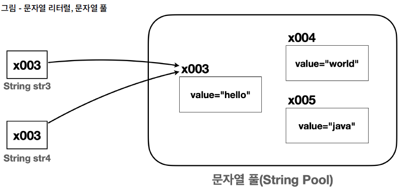 - String str3 = "hello"와 같이 문자열 리터럴을 사용하는 경우 자바는 메모리 효율성과 성능 최적화를 위해 문자열 풀을 사용한다.
