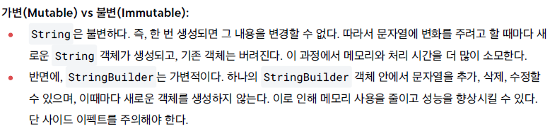 String의 불변으로 인한 문제를 해결하기 위한 가변 String으로 내부의 값을 바로 변경하면 되기 때문에 객체를 생성할 필요가 없어 성능과 메모리 사용면에서 일반 String 보다 효율적이다(사이드 이펙트에 주의해서 사용해야 한다).