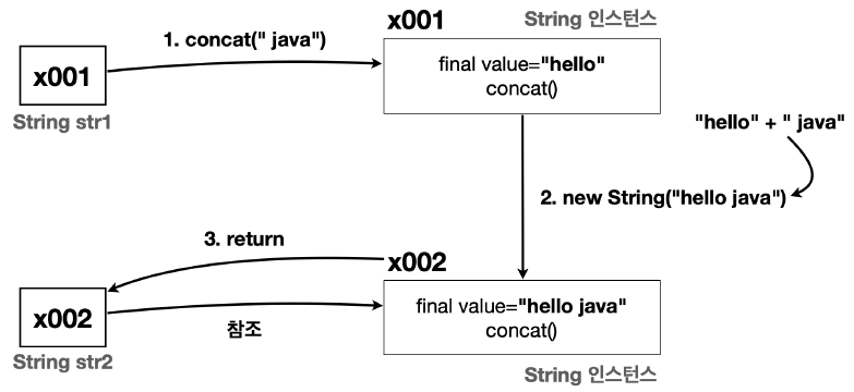 - String.concat()은 내부에서 새로운 String 객체를 만들어서 반환하기 때문에 불변과 기존 객체의 값을 유지한다.