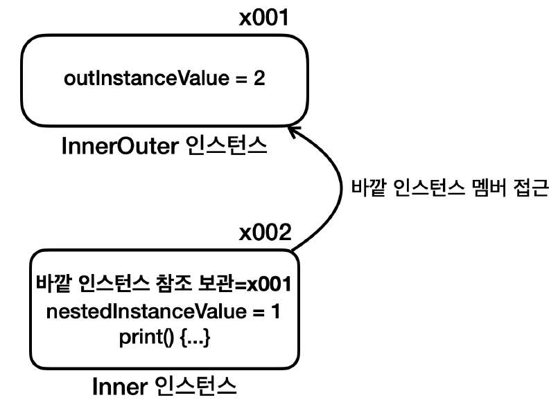 - 바깥 클래스의 인스턴스에 소속된다.