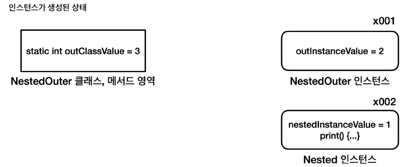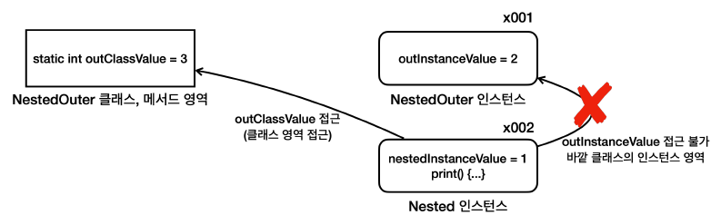 - 중첩 클래스는 NestedOuter.Nested와 같이 바깥 클래스.중첩클래스로 접근할 수 있음