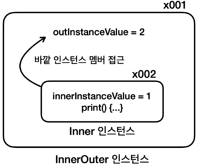 - 내부 클래스(inner class): 바깥 클래스의 인스턴스 멤버에 접근