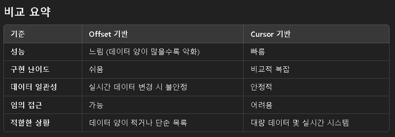 - offset은 구현이 쉽지만 대용량 데이터에서 성능이 떨어짐, cursor는 대용량 데이터에서 성능적 이점이 있지만 구현이 어려움