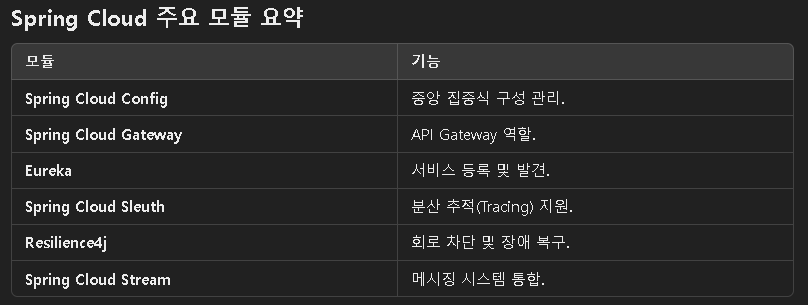 Spring Cloud는 MSA 기반 애플리케이션을 쉽게 개발하고 운영할 수 있도록 도와주는 Spring 프레임워크 확장 프로젝트로 분산 시스템에서 발생하는 문제를 효율적으로 해결할 수 있는 다양한 도구와 라이브러리를 제공한다.