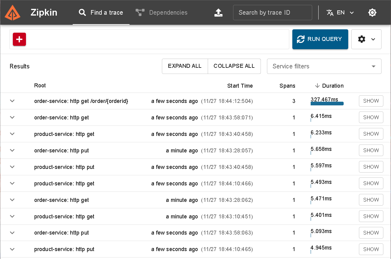 - ZipKin 대시보드의 Run Query를 누르면 방금 전 호출했던 API를 확인할 수 있다.
