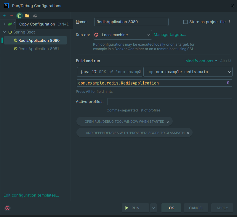 - Copy Configuration을 눌러 Application의 Configuration을 복사 후 Modify options의 add VM options 선택