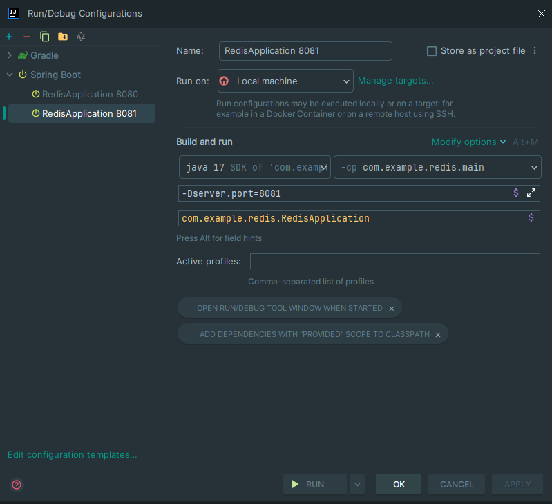 - -Dserver.port=8081 을 입력해 애플리케이션을 8081 포트로 실행할 수 있도록 변경.