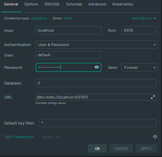 기본 유저 default와 yml에서 설정한 패스워드를 입력 후 Test Connection이 성공하면 OK를 누른다.