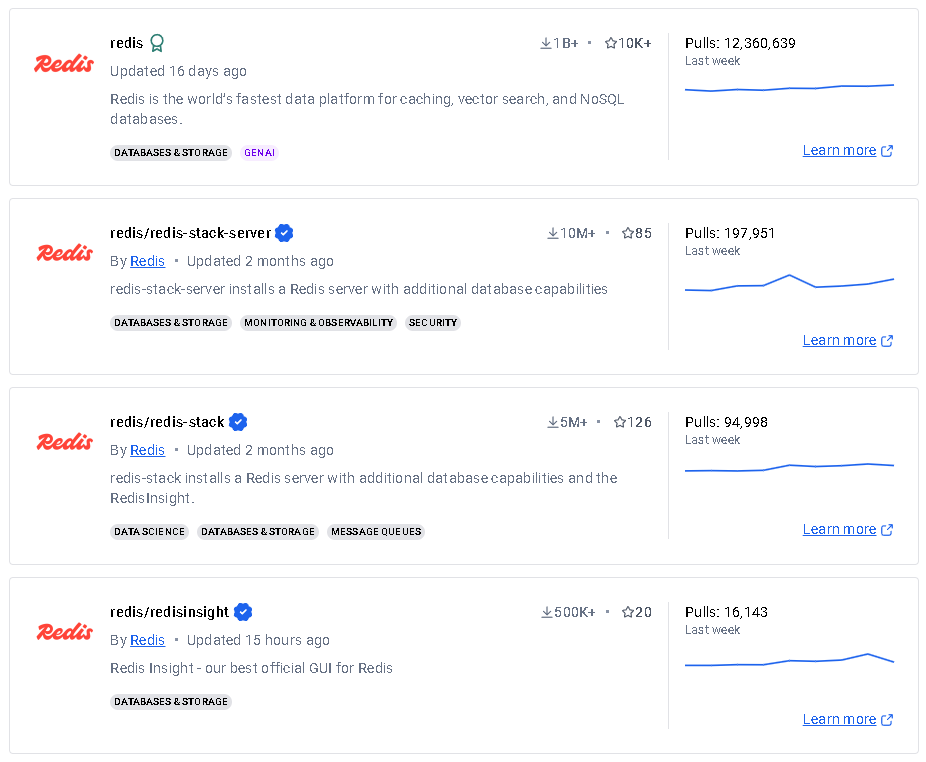 - redis/redis-stack-server: 여러 플러그인이 추가된 Redis Stack 서버 이미지. 확률형 데이터, JSON 문서 등을 사용할 수 있음