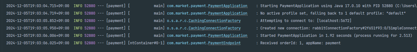 2-4. Payment Application 실행 및 메시지 수신 확인