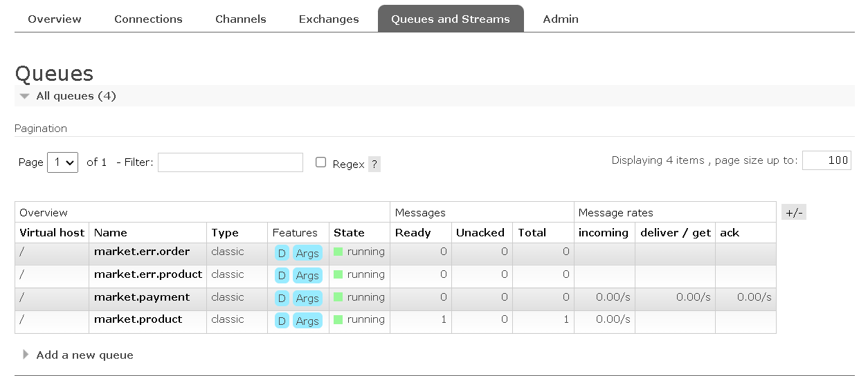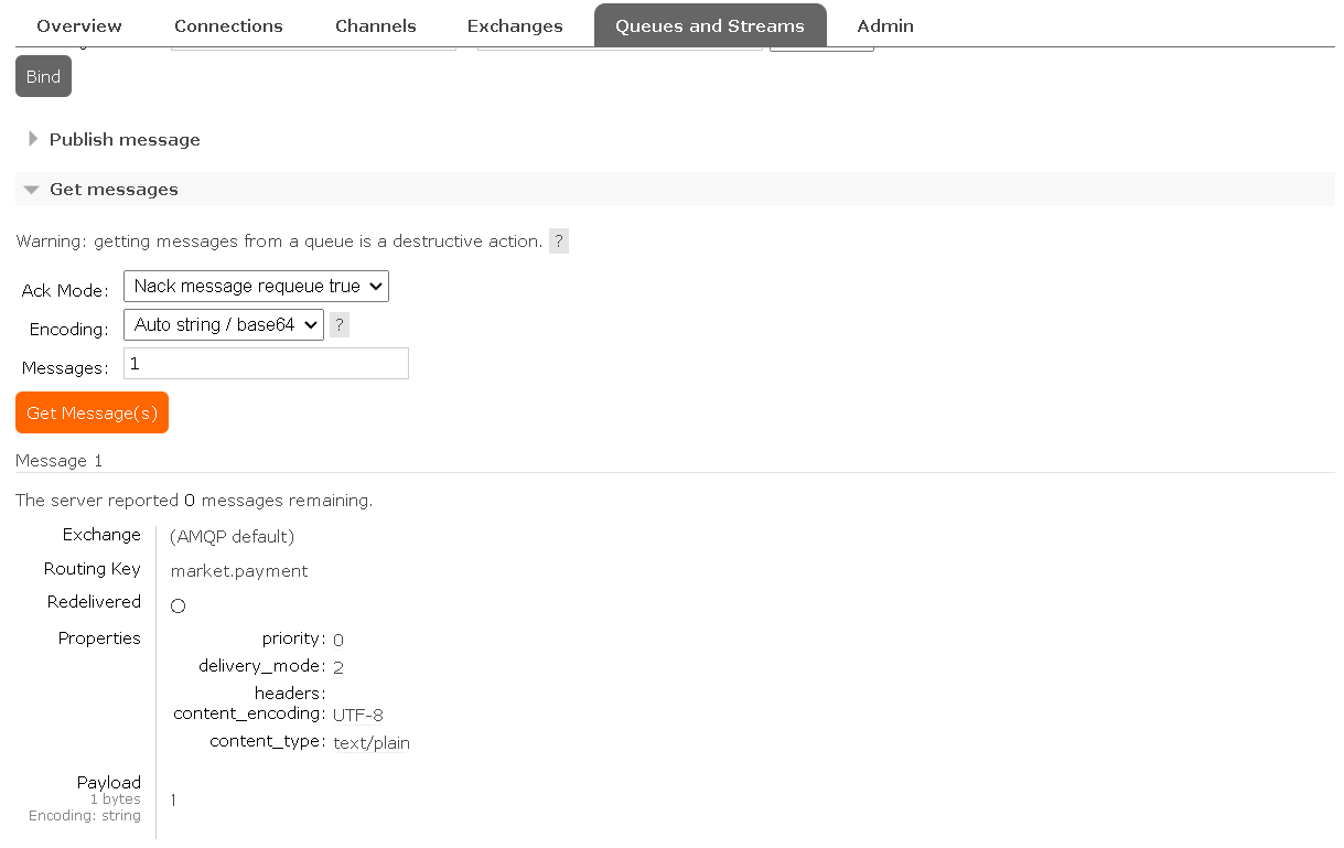 - RabbitMQ 대시보드에서 market.payment, market.payment 큐에 메시지가 있는 것을 확인할 수 있다.