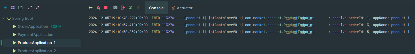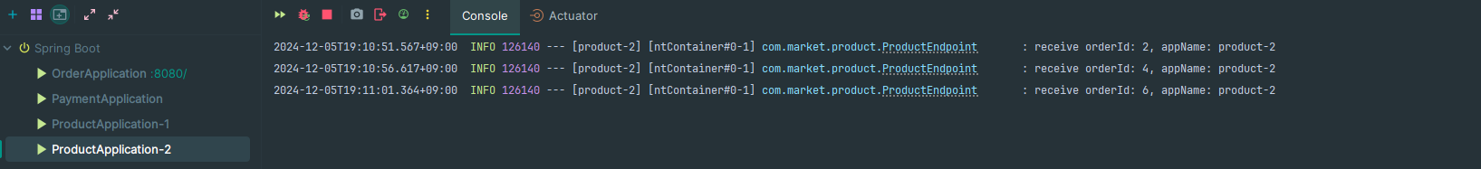 2-7. Product Application 2개 실행 후 Order를 통해 메시지 송신