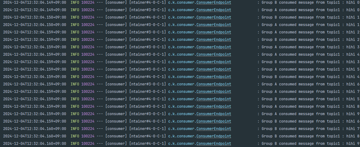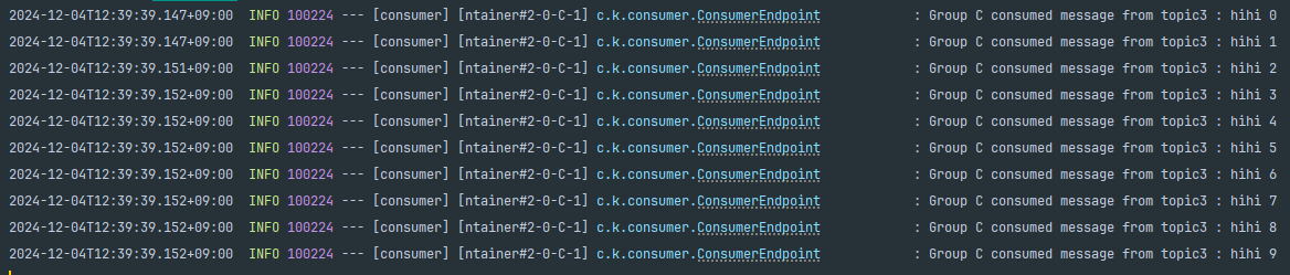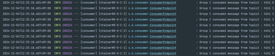 - 각각의 Topic에 대한 메시지를 Consumer Group C가 수신하는 것을 확인할 수 있다.