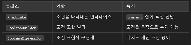 - 주요 사용처: JPAQuery의 where() 메서드에 전달해 조건 필터링을 수행.