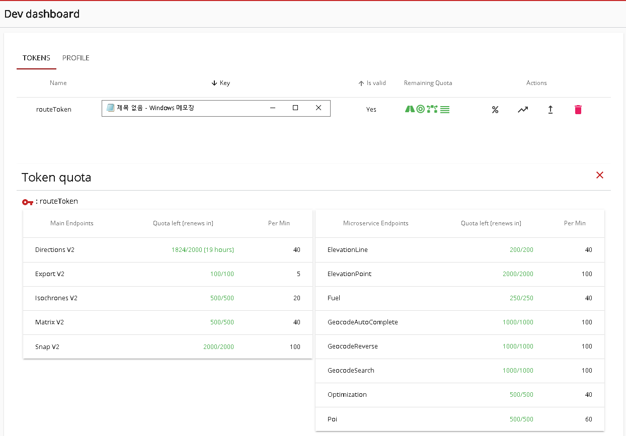 - 무료 등급 토큰을 발급 받은 후 key를 복사한다.