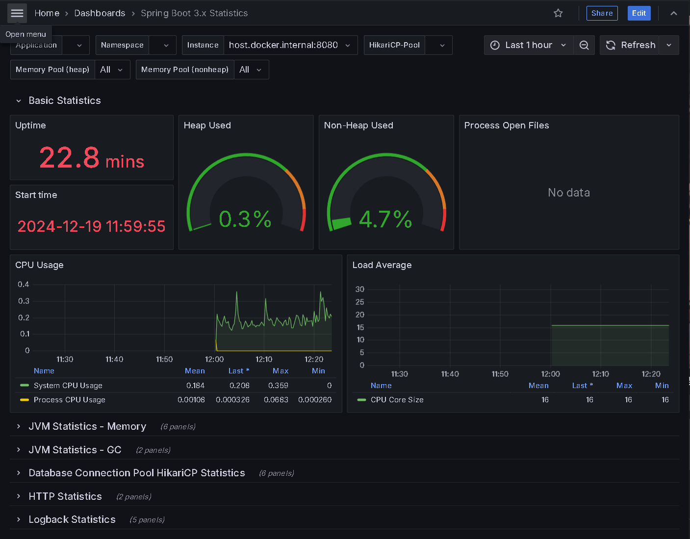 - 엔드포인트 제공: 상태 확인(/actuator/health), 메트릭(/actuator/metrics), 로그 수준 조정 등