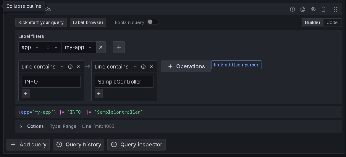 - Line contains INFO(로그 설정), Line contanis SampleController(사용하는 컨트롤러) 설정