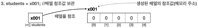 - 앞서 선언한 배열 변수인 int[ ] students에 생성된 배열의 참조값(x001)을 보관한다.