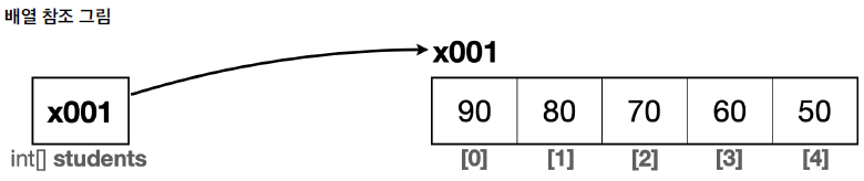 - 배열을 생성하고 나면 자바는 메모리 어딘가에 있는 배열에 접근할 수 있는 참조값(주소)(x001)을 반환