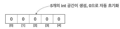 - new int[ 5 ] 라고 하면 총 5개의 int형 변수가 만들어진다. 자바는 배열을 생성할 때 그 내부값을 자동으로 초기화한다.