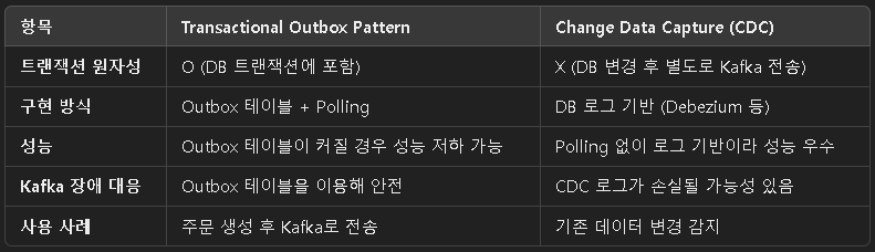 - 둘을 함께 사용하면 Outbox 테이블을 CDC로 감지하여 Kafka로 이벤트를 발행하는 형태로 구현할 수도 있음.