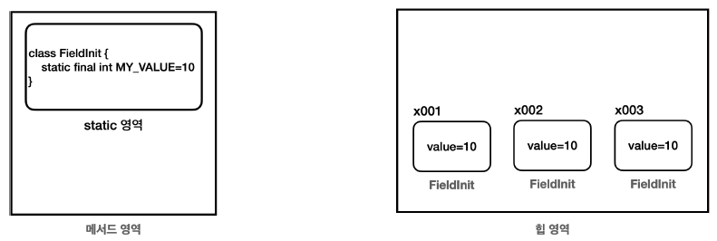 - FieldInit과 같이 final 필드를 필드에서 초기화하는 경우, 모든 인스턴스가 같은 값을 가진다.