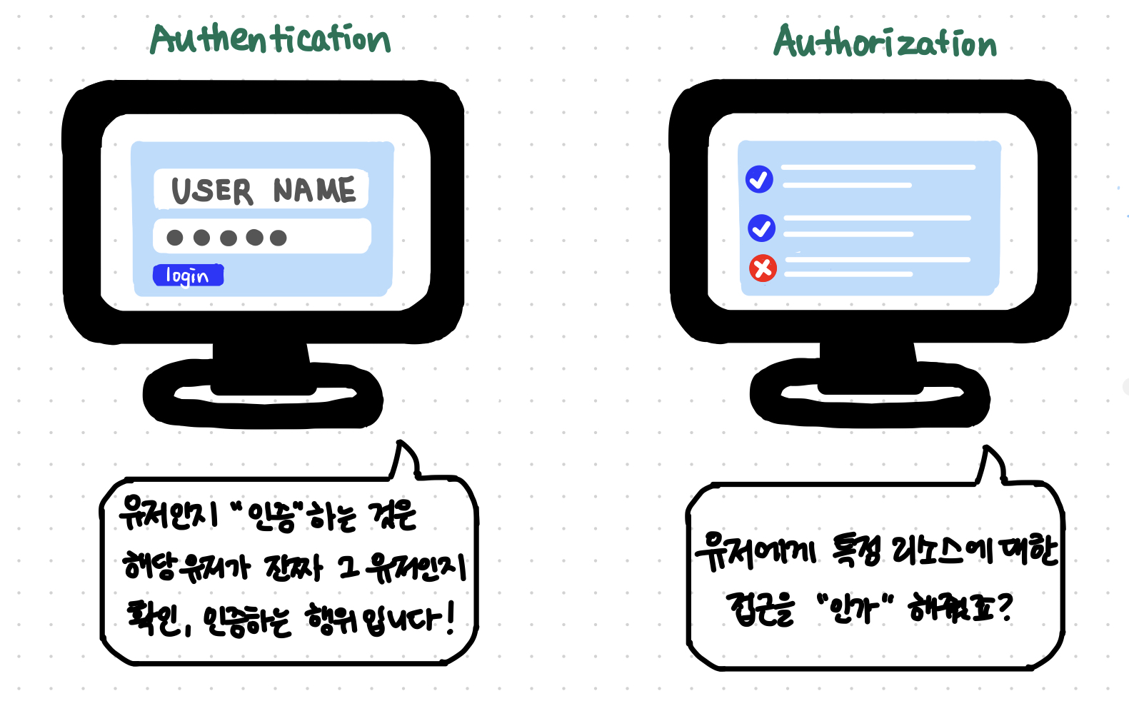 - 인가는 해당 유저가 특정 리소스에 접근이 가능한지 허가를 확인하는 개념