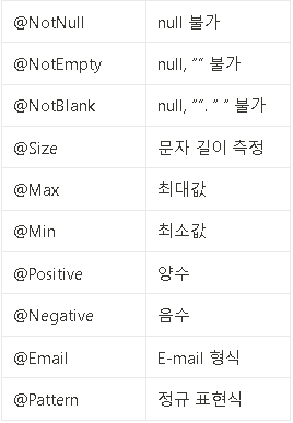 - Spring에서는 null 확인 뿐 아니라 문자의 길이 측정과 같은 다른 검증 과정도 쉽게 처리할 수 있도록 Bean Validation 제공