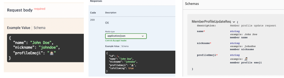 - Swagger 제공 @Schema 어노테이션을 이용해 각 필드에 대한 설명, 예시, 필수값 여부를 추가할 수 있음