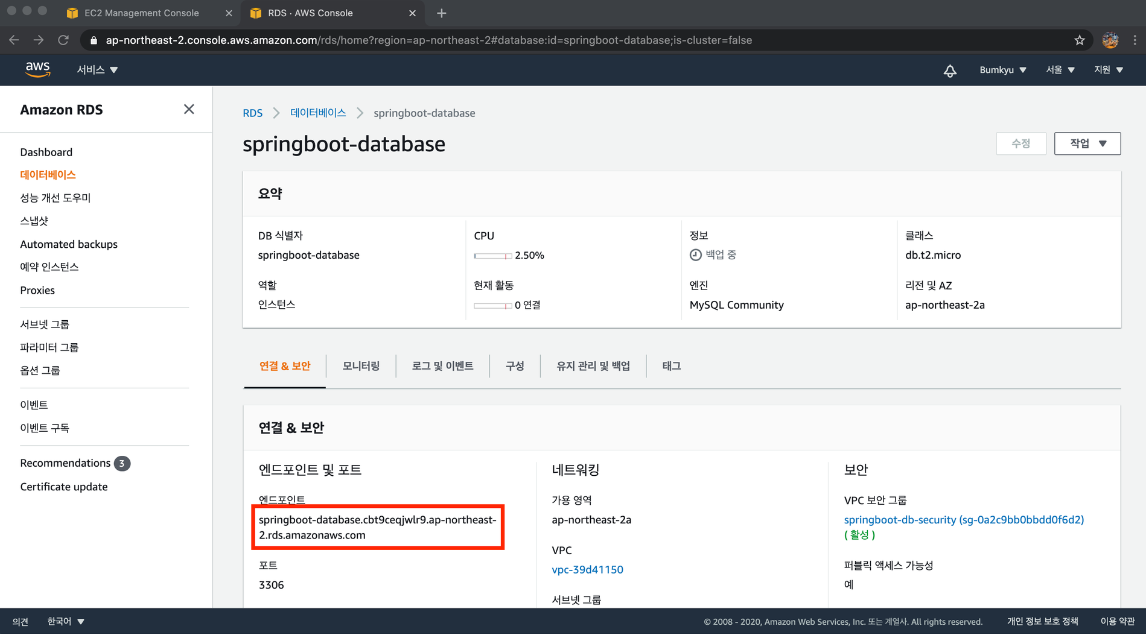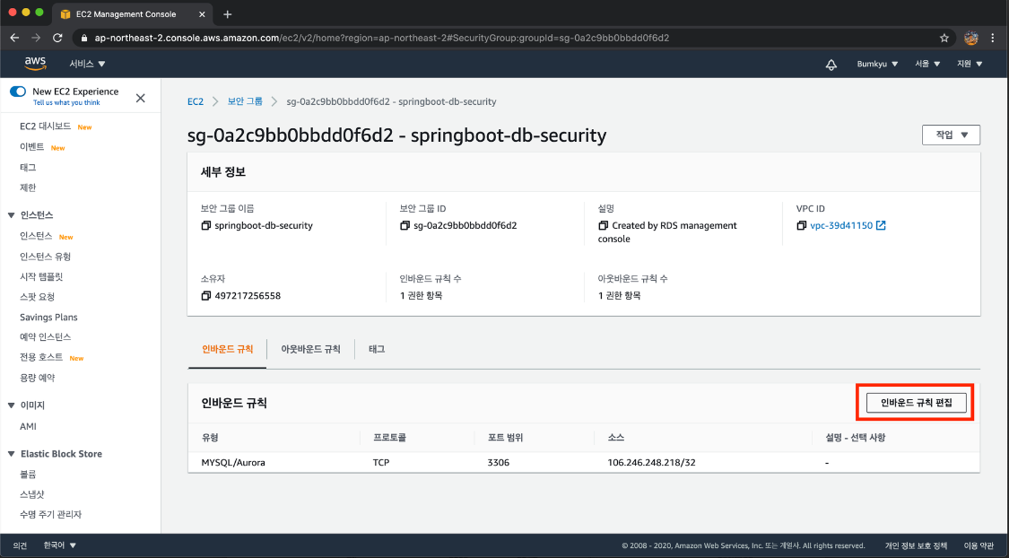 2. 연결& 보안 → 보안 → VPC 보안 그룹의 springboot-db-security 클릭