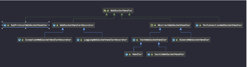 Spring은 WebSocketHandler가 호출되기까지 여러 Decorator를 거침(스프링은 데코레이터 패턴을 이용해서 WebSocketHandler에 대한 추가적인 작업을 처리할 수 있도록 WebSocketHandlerDecorator 객체를 제공)