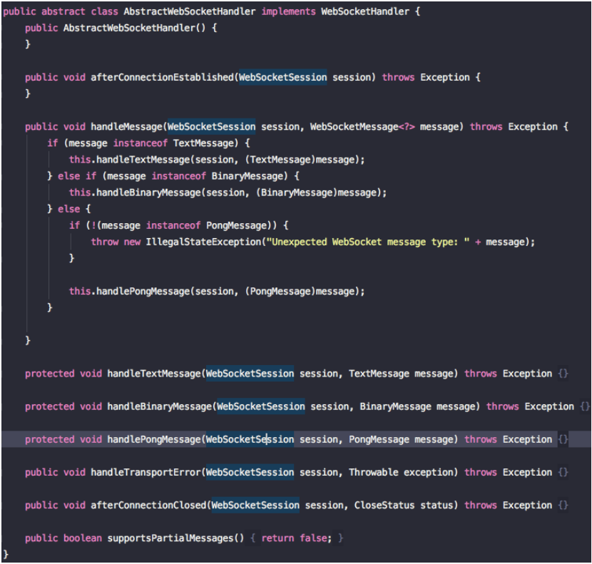 - 마지막으로, AbstractWebSocketHandler는 Message 타입에 따라 handleXXX() 메서드를 호출함